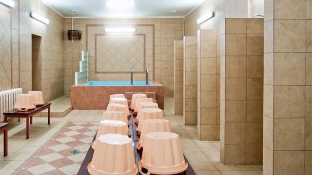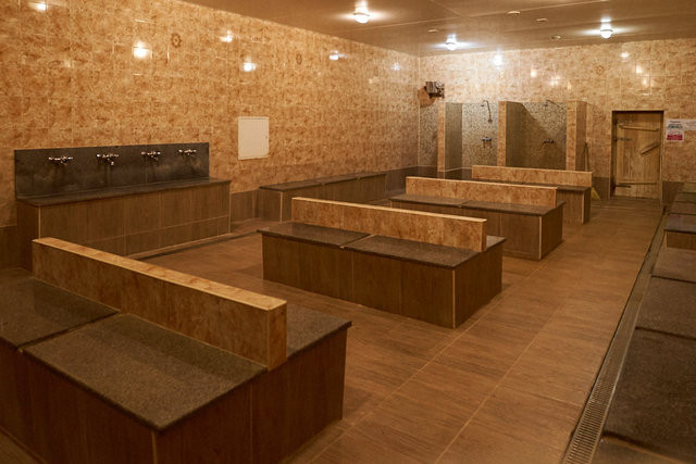 В помывочных комнатах посетителей ждут комфортные душевые кабины, небольшой бассейн с прохладной водой, купели, поливочные ведра, скамейки и тазики.